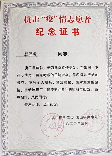 【战疫·党员先锋】桂厚瑛老师获洪山街抗击“疫”情志愿者纪念证书
