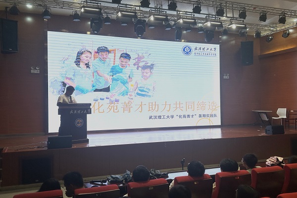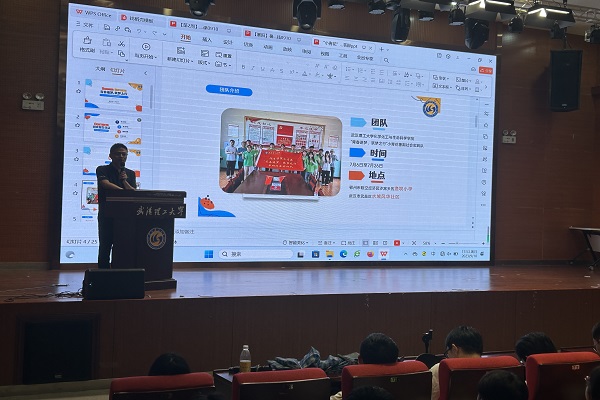 在两个实践队进行展示之后,操一铭老师上台总结,表扬了武汉理工大学“化苑菁才”暑期实践队的优秀知识体系并肯定了小青花暑期社会实践队不畏艰苦的精神。