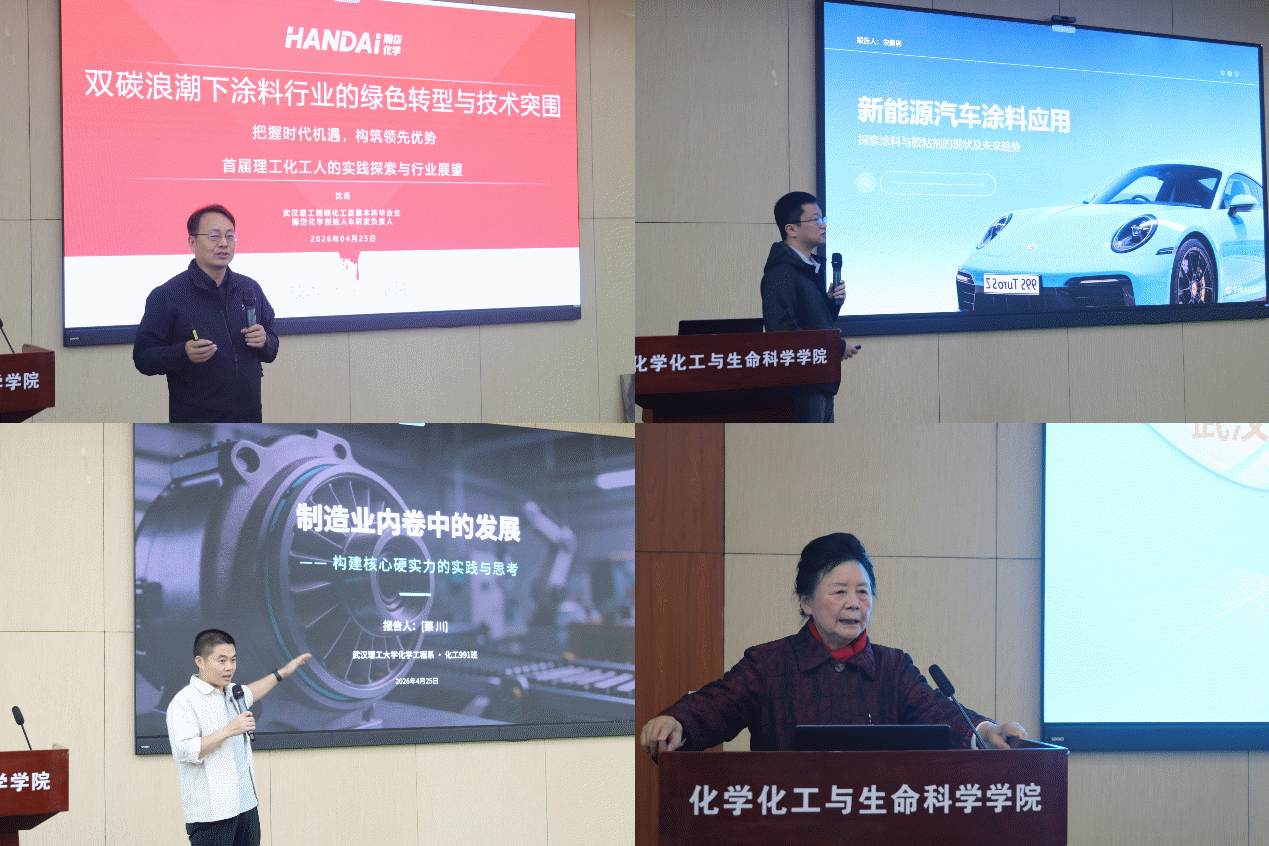 大会报告环节大咖云集,干货满满。面对涂料行业的绿色变革,沈岳校友以“‘双碳’浪潮下涂料行业的绿色转型与技术突围”为题,深入剖析了首届理工化工人在这股浪潮中的生动实践与前瞻思考。针对迅猛发展的新能源汽车产业,宋勇男校友带来了“新型涂料在新能源汽车车身应用”的专业分享,展示了功能性涂料在轻量化与防护性能上的最新突破。