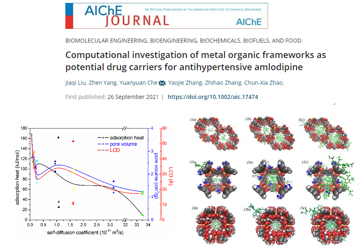 近日,我校真人娱乐场 车圆圆副教授课题组在新型多孔材料药物载体的筛选和主-客体分子相互作用机制研究方面取得重要进展,相关研究成果在线发表于国际化工领域顶级期刊《AIChE Journal》(美国化学工程师协会会刊)上(Computational investigation of metal organic frameworks as potential drug carriers for antihypertensive amlodipine)。真人娱乐场-真人赌场 是唯一通讯单位,19级硕士生刘嘉琪为第一作者,车圆圆副教授为唯一通讯作者。
